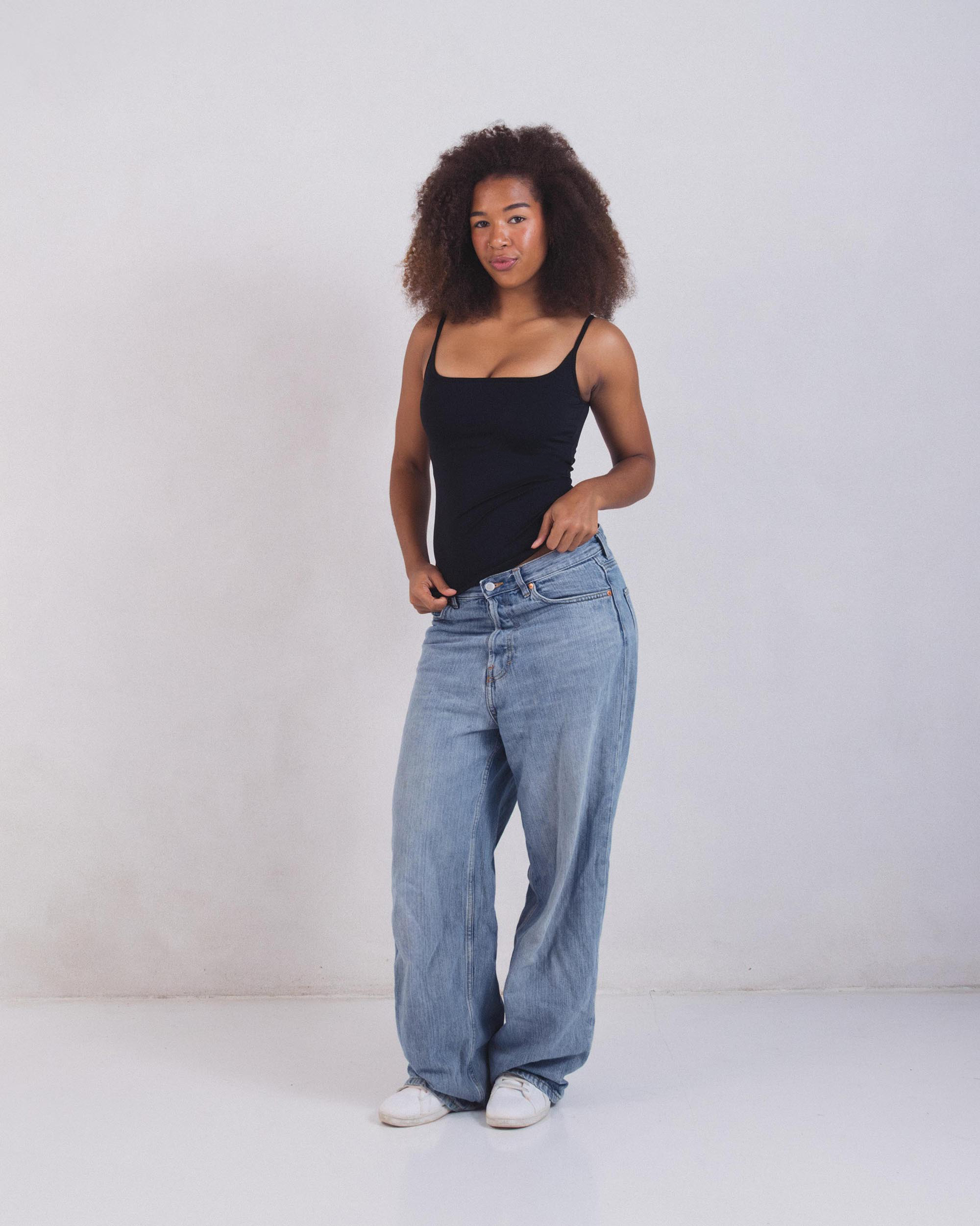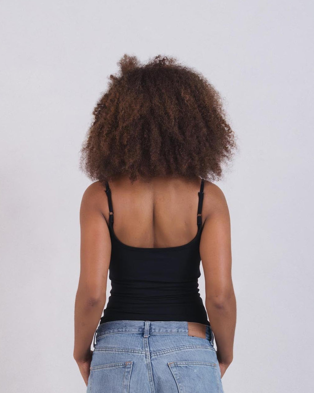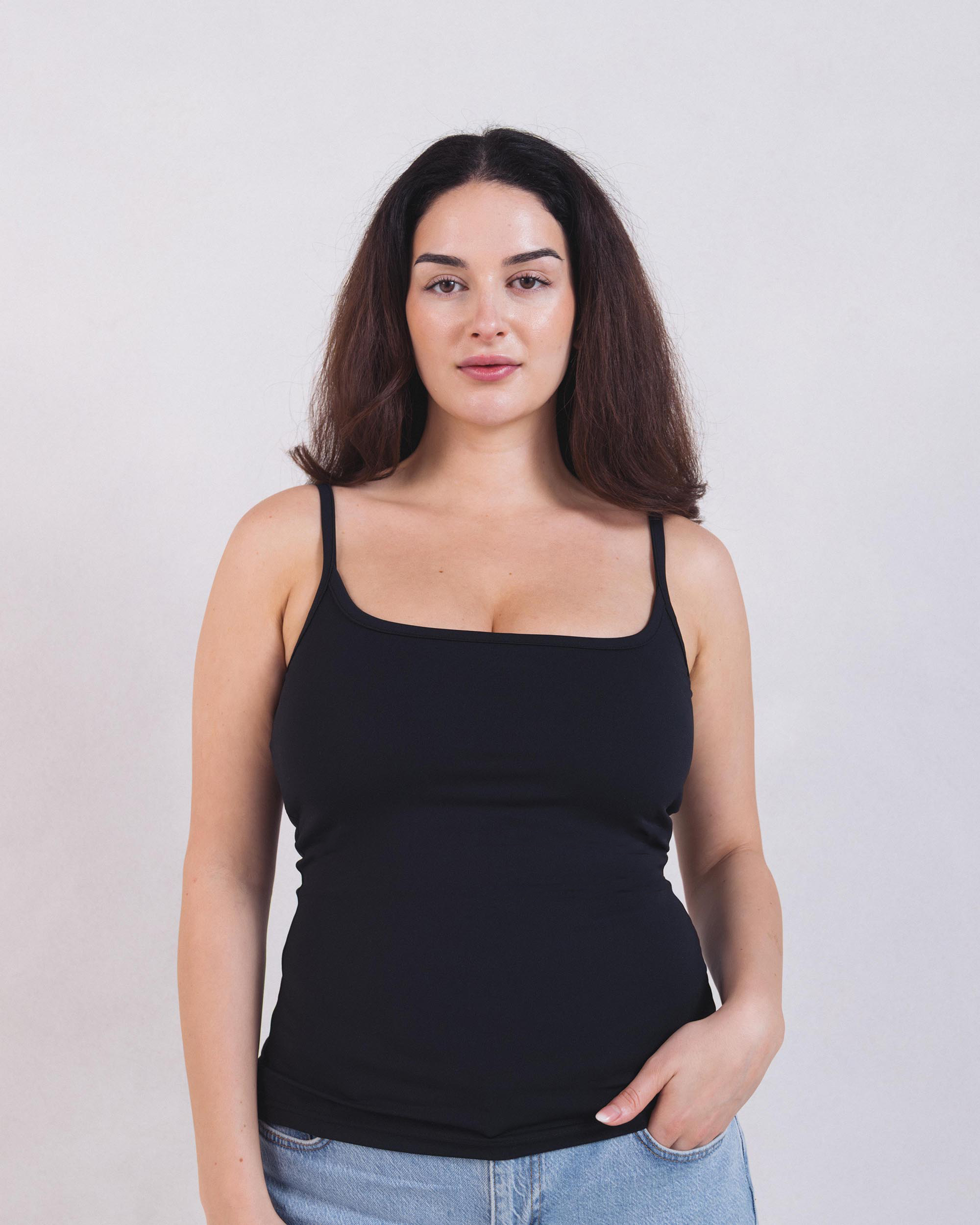 - Nylon-styles Cami Ayo og Square Neck Azara (nylon/spandex) føles naturligt mere snug og støttende og sidder derfor mere tight med en let shapewear-fornemmelse.
